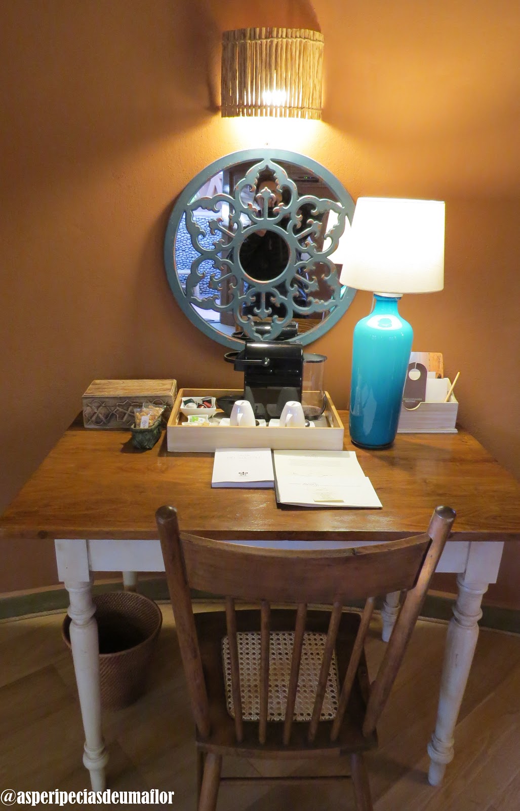 Todas as suítes possuem free WiFi, telefone e cofre e, estão equipadas com amenites da L’Occitane, tais como, shampoo, condicionador, sabonete e body lotion, touca de banho, secador, espelho específico para maquiagem (ou para checar as perfeições e imperfeições), kit costura e manicure, além do que chamaria de kit deserto, composto por um recipiente de manteiga de cacau para os lábios e outro de creme hidratante (bem hidratante mesmo) feitos de forma personalizada para o hotel.