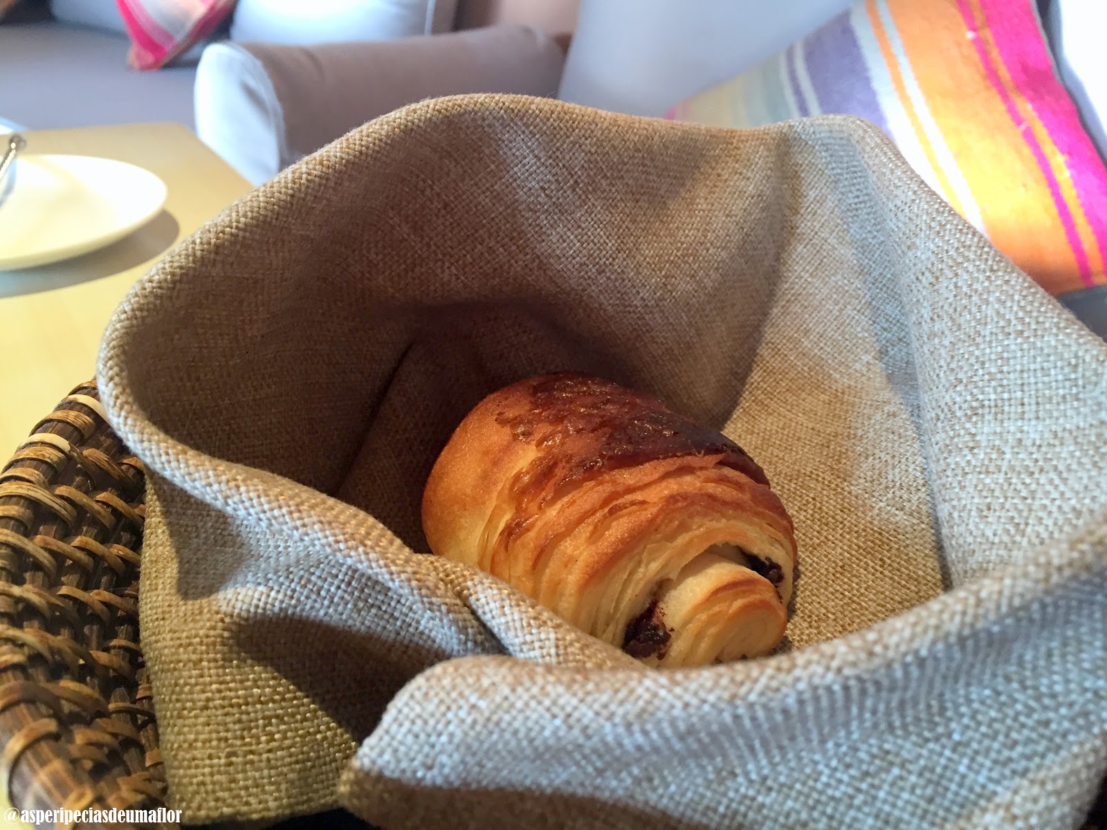 E para o pão recheado com chocolate, um dos meus preferidos, que é aquecido na hora e embalado em um guardanapo de pano para manter a sua temperatura.
