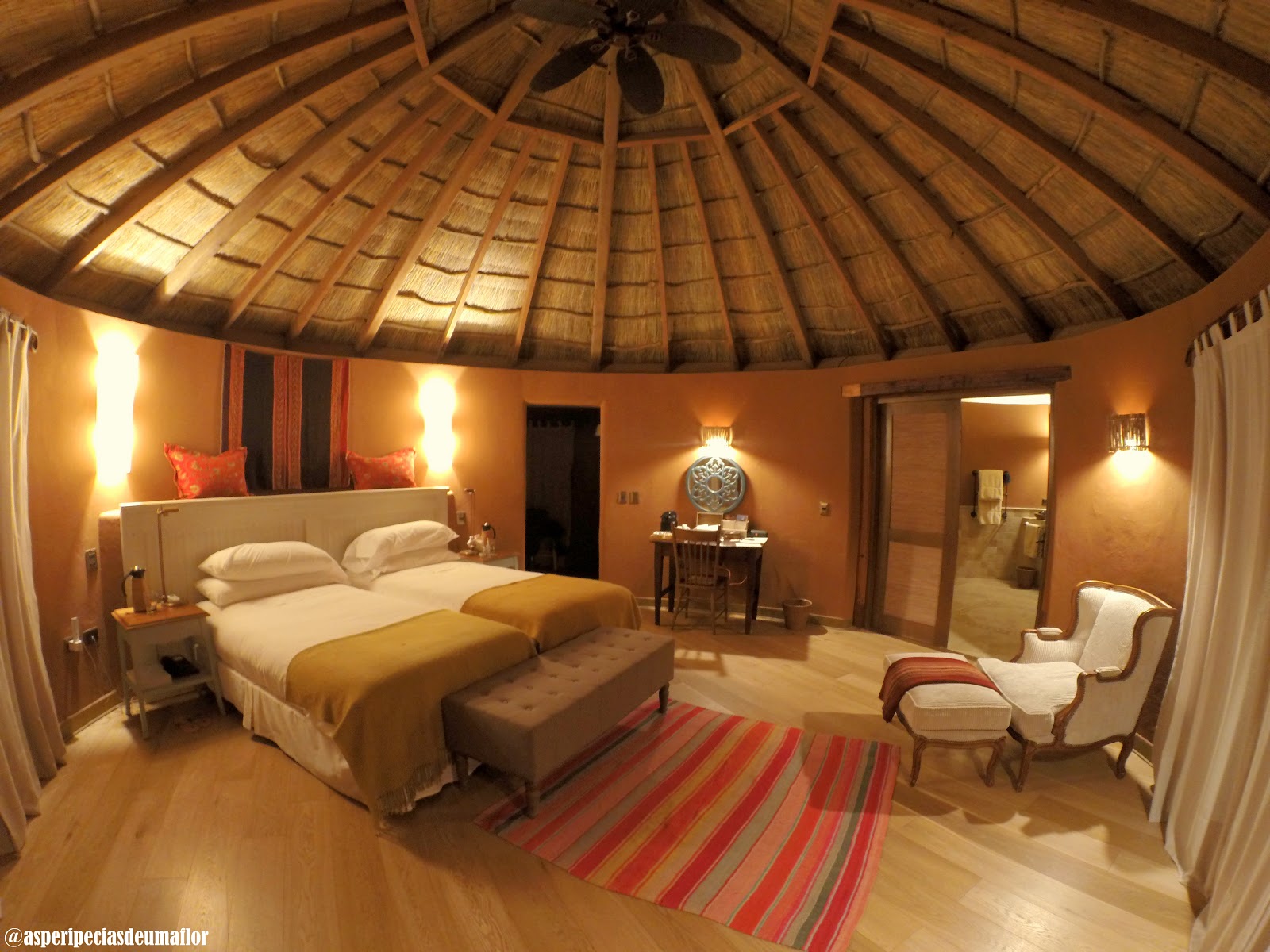 a) Suíte redonda superior: com 67m2, cama king size e capacidade para duas pessoas, a suíte possui solário de 11 m2 ao ar livre, com espreguiçadeiras e chuveiro externo, aonde o hóspede pode relaxar durante o dia e admirar as estrelas (lembre-se que o Atacama possui um dos céus mais iluminados do mundo) durante a noite. Além disso, a suíte possui hall de entrada ao ar livre, escrivaninha, closet, cafeteira com produtos Nespresso e alguns mimos como amêndoas, passas entre outros.