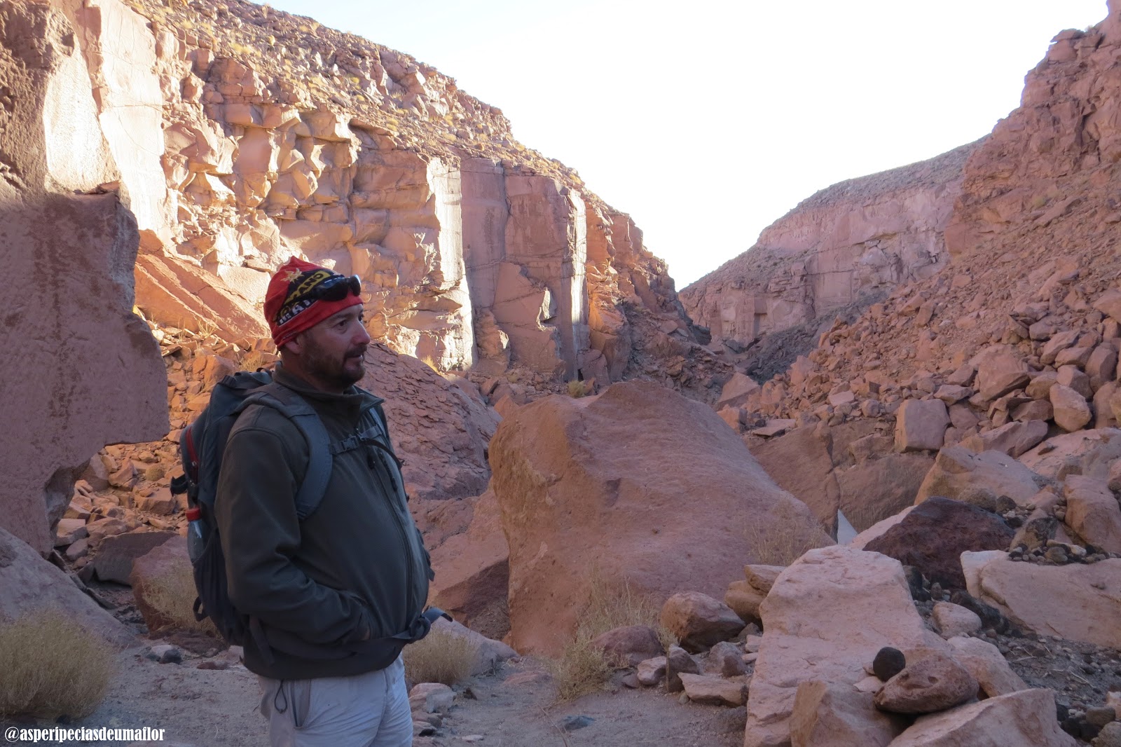 O primeiro passeio do dia teria seu término na Garganta do Diabo e, para começarmos o trekking, teríamos que escalar uma montanha vulcânica que quando olhei bateu aquele desespero e falei: Não consigo subir, tenho medo. – Vendo que realmente estava apreensiva, um dos guias, o Alejandro, veio imediatamente perto de mim, segurou a minha mão e disse: “Respira, segura a mão e vamos subir juntos. Estou aqui com você e não vai acontecer nada”. E foi o que aconteceu, nada além de orgulho por ter vencido aquele medo todo. Depois que subimos, ele procurou um galho de ryca ryca (espécie de flor do deserto que acalma – com cheiro de azaléia) e entregou para mim para que pudesse cheirar ao longo do trajeto. – O Alejandro foi um anjo e fez toda a diferença no meu passeio. Além de muito educado e dedicado, ele conhece muito sobre qualquer coisa relacionada ao Atacama e suas civilizações.