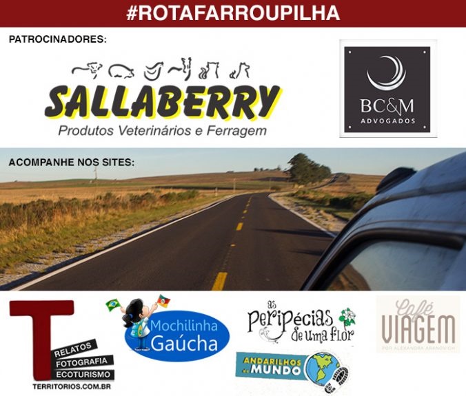 O projeto Rota Farroupilha e seus envolvidos:O projeto #RotaFarroupilha é um projeto dos blogs Territórios e As Peripécias de Uma Flor em parceria com os blogs Café Viagem e Mochilinha Gaúcha, que contou com as participações especiais do blog Andarilhos do Mundo e a jornalista Criz Azevedo.