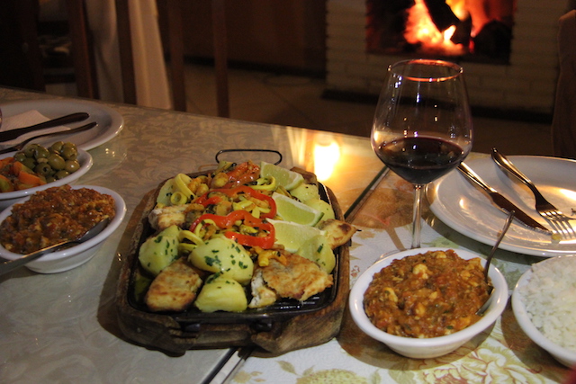 Sugestão do próprio Sr. Hosman, a nossa pedida foi a divina, bem servida e, de comer rezando, parillada de frutos do mar (lula, camarão, mariscos, tainha e linguado), acompanhada de arroz, pirão e batata sauté e harmonizada com um belo vinho Merlot gaúcho e uma lareira bem a nossa frente para amenizar a baixa temperatura do lado de fora. O prato é bem farto, podendo ser dividido tranquilamente por três pessoas boas de garfo, como nós.