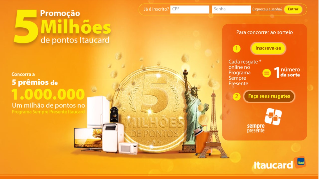 No próximo dia 31 de dezembro, o Banco Itaú sorteará um adicional de um milhão em pontos para cinco participantes do Programa Sempre Presente Itaucard, que poderão ser resgatados com passagens aéreas, aluguel de carro, diária em hotéis e tantos outros produtos do catálogo.
